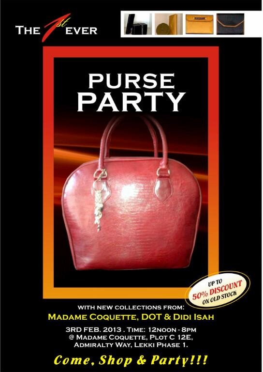 Come, Party and Shop at the first ever Purse Party, Up to 50% discount on old stock! plus fabulous new collections from Madame Coquette, Dot & Didi Isah